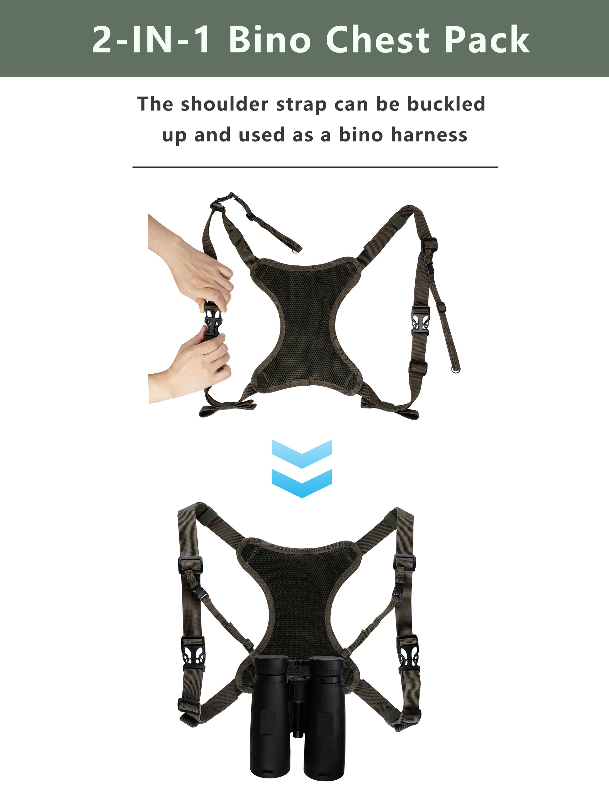 | ●1 Chest Pack for 2 Purposes● All harness buckles use the same model, they can be used alone as a bino harness or as a chest pack, just need to buckle the upper and lower buckles to form a strap around the shoulder, use the small narrow strap to hang the bino. Purchasing this product is equivalent to receiving two products. |