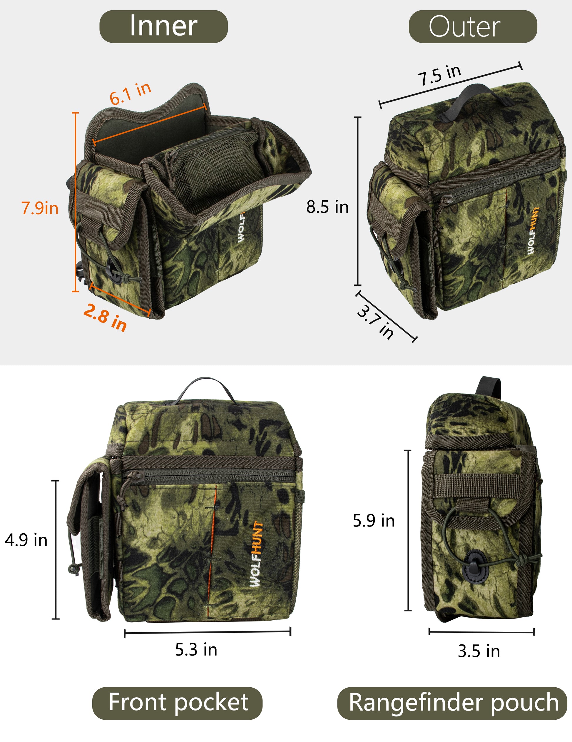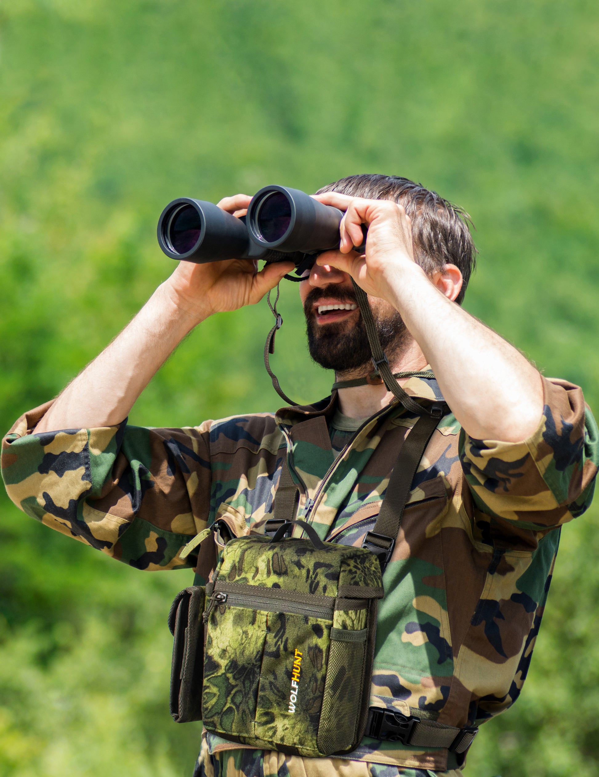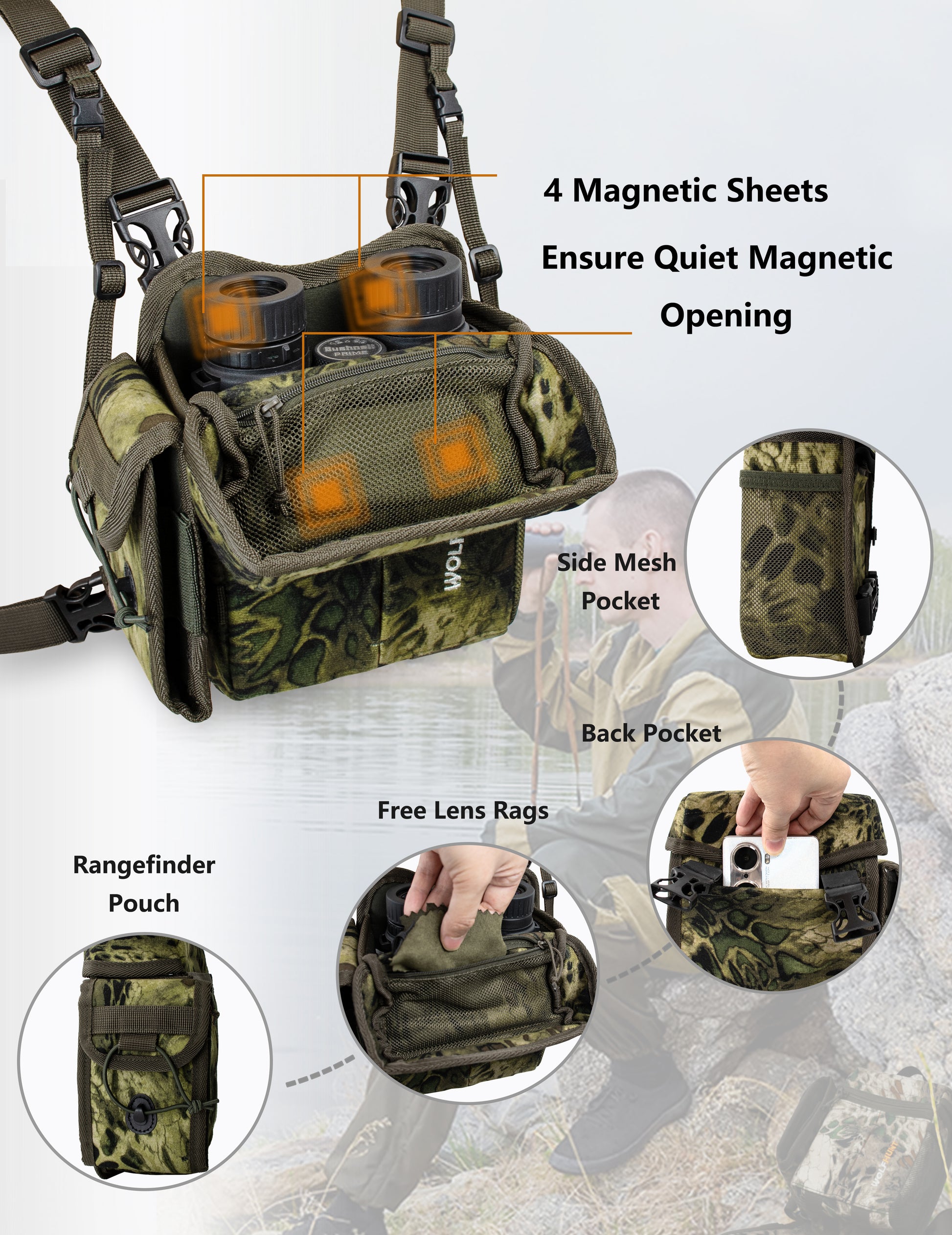 WOLFHUNT Binocular Harness Chest Pack Magnetic Closure, Bino Case with Detachable Rangefinder Pouch, Camouflage Bino Bag with Adjustable Strap for Hunting, Prym 1 Woodlands