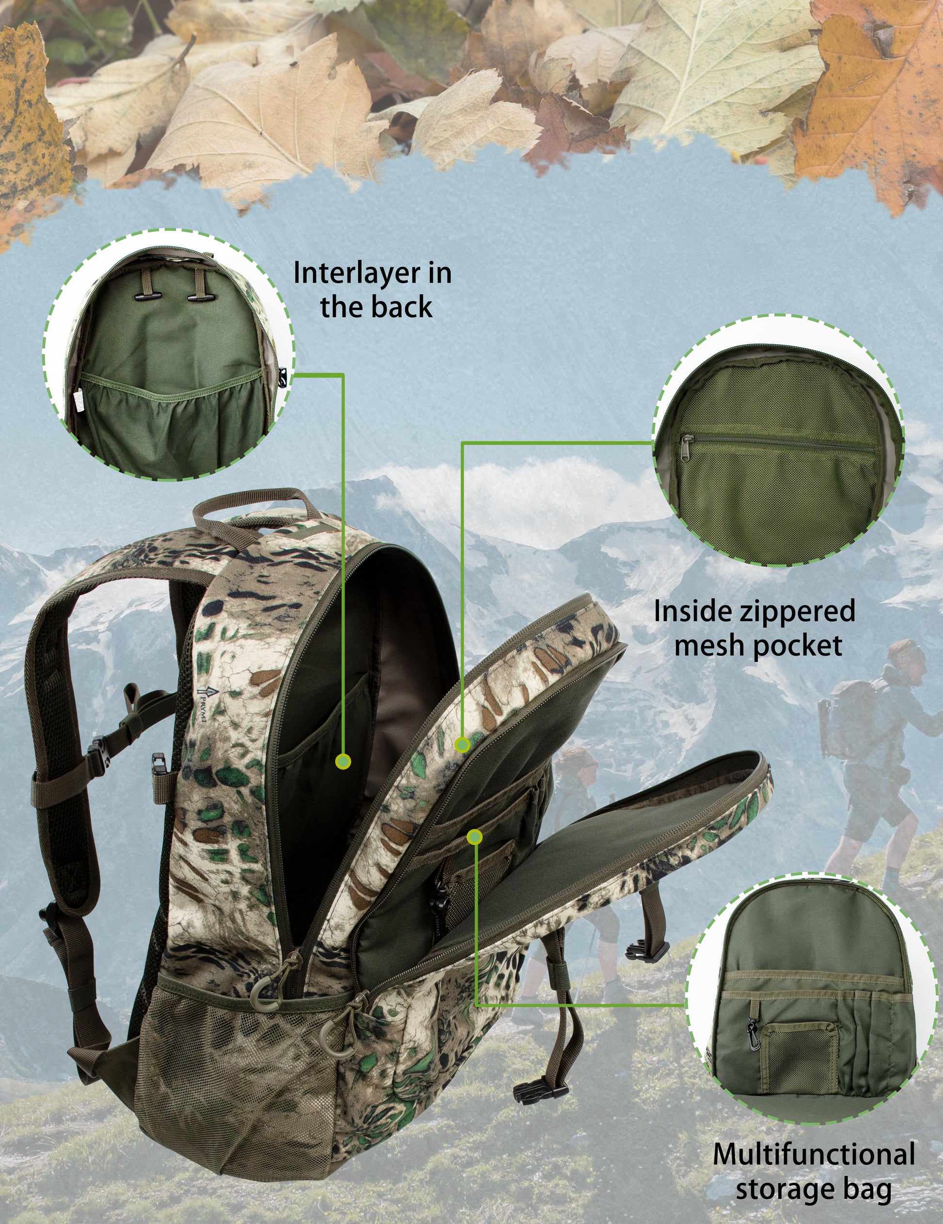 | 【Versatile as a Normal Pack or Hunting Backpack】 This camouflage backpack has a 24L capacity, medium size makes it neither big nor small. Just enough for your daily needs, suitable for a 1-2 day adventure or excursions. Also suitable for small hunting, reducing your load. |
